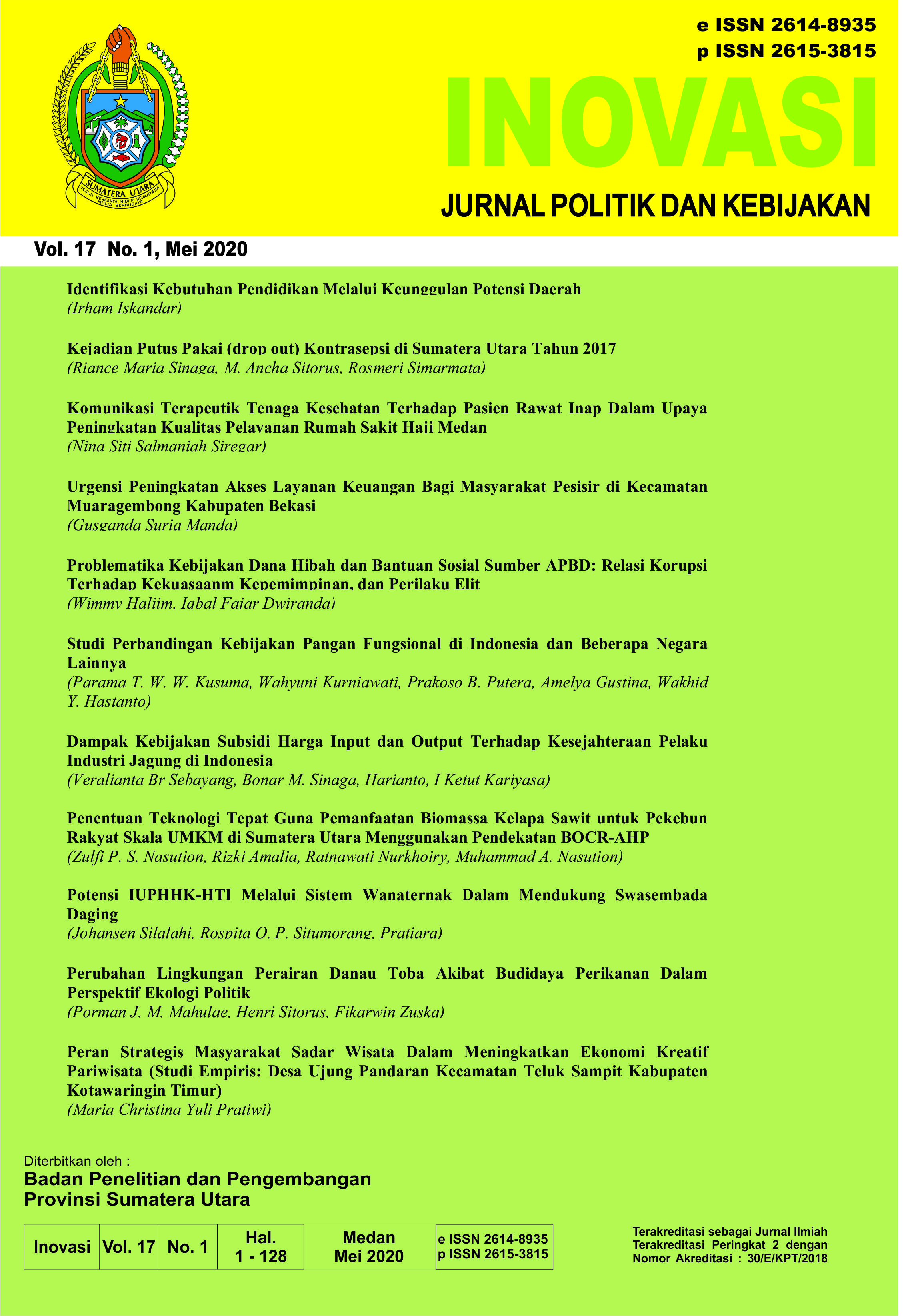 Jurnal Inovasi edisi Mei 2017 ini mengusung tema utama “Ekonomi, Sosial, Lingkungan dan Energi, serta Pertanian” yang merupakan isu – isu strategis di Sumatera Utara. Adapun tulisan-tulisan terkait kebijakan pemerintah dan ekonomi adalah: Peran Kementerian Riset, Teknologi Dan Pendidikan Tinggi Dalam Penguatan Sistem Inovasi Di Indonesia dan Strategi Pengembangan Sukuk Korporasi Di Indonesia: Metode Analytical Hierarchy Process. Sedangkan tulisan yang bertemakan Sosial adalah: Sumberdaya Manusia Guru SMP Dalam Rangka Peningkatan Mutu Pendidikan, Realita Pekerja Anak Di Wilayah Pesisir Kota Tanjungbalai, Strategi Pengelolaan Dana Bantuan Sosial, dan Formulasi Strategi Penataan Pedagang Kaki Lima Di Kabupaten Jombang Menggunakan Matrik Quantitative Strategic Planning (Qsp). Tulisan yang bertemakan lingkungan dan energy adalah: Implementasi Kebijakan Pemanfaatan Energi Baru Terbarukan (EBT) Dalam Pemenuhan Kebutuhan Listrik Di Desa-Desa Terpencil Di Sumatera Utara dan Analisis Permasalahan Pengelolaan Sungai Deli. Serta tulisan yang bertemakan pertanian adalah: Model Kelembagaan Pemasaran Cabai Merah Di Kawasan Sentra Produksi Pertanian Sumatera Utara, dan Kelembagaan Pemasaran Komoditas Jagung Di Kawasan Sentra Produksi.