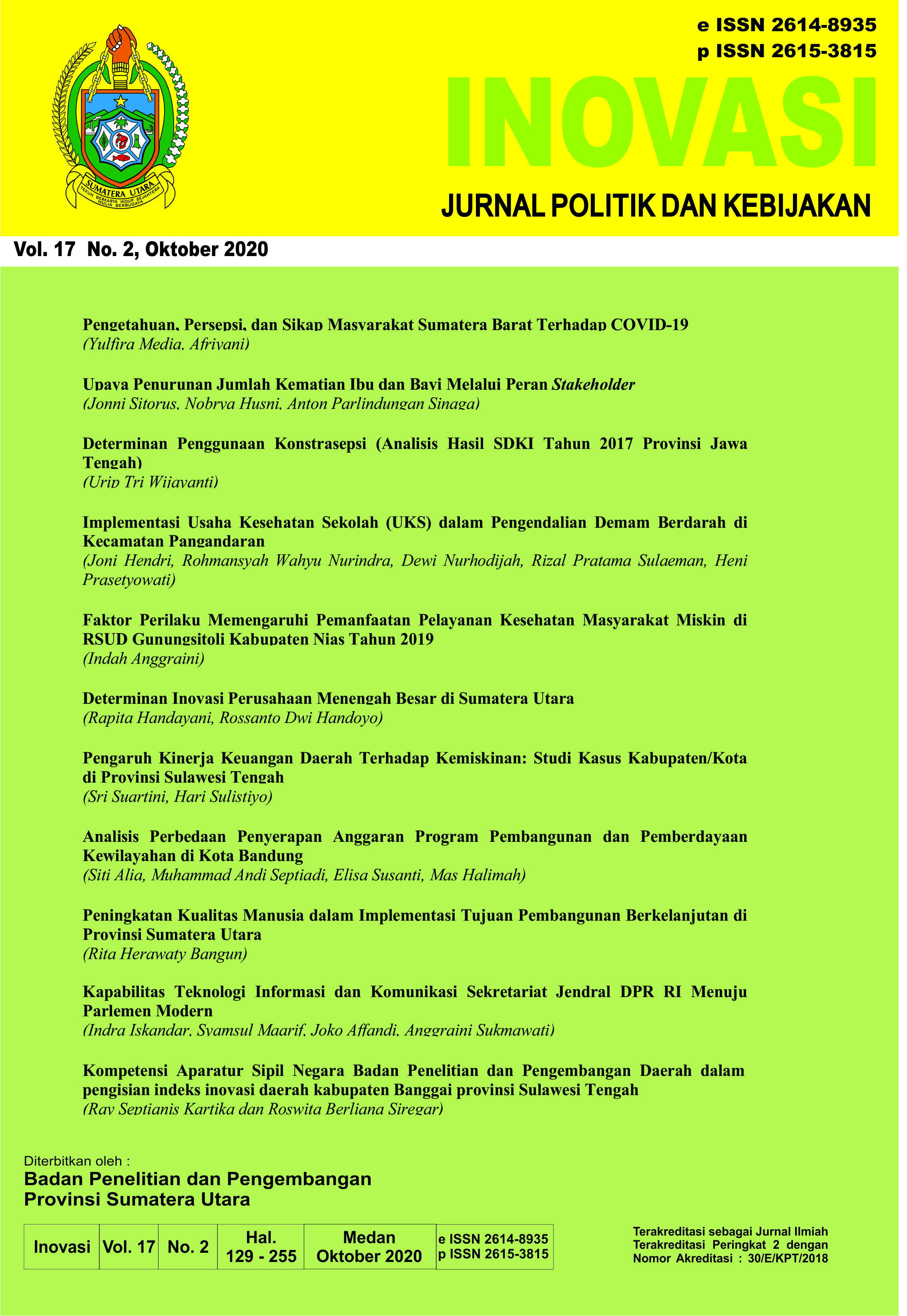 Jurnal INOVASI Edisi Oktober 2020 kali ini menampilkan 5 (tulisan) dari aspek kesehatan, salah satunya tentang pengetahuan, persepsi dan sikap masyarakat di Sumatera Barat dalam menghadapi pandemi COVID-19. Tulisan lainnya membahas tentang upaya penurunan kematian ibu/bayi, penggunaan kontrasepsi, implementasi UKS dalam pemberantasan demam berdarah, serta pelayanan kesehatan masyarakat miskin di Rumah Sakit Gunungsitoli Kabupaten Nias.