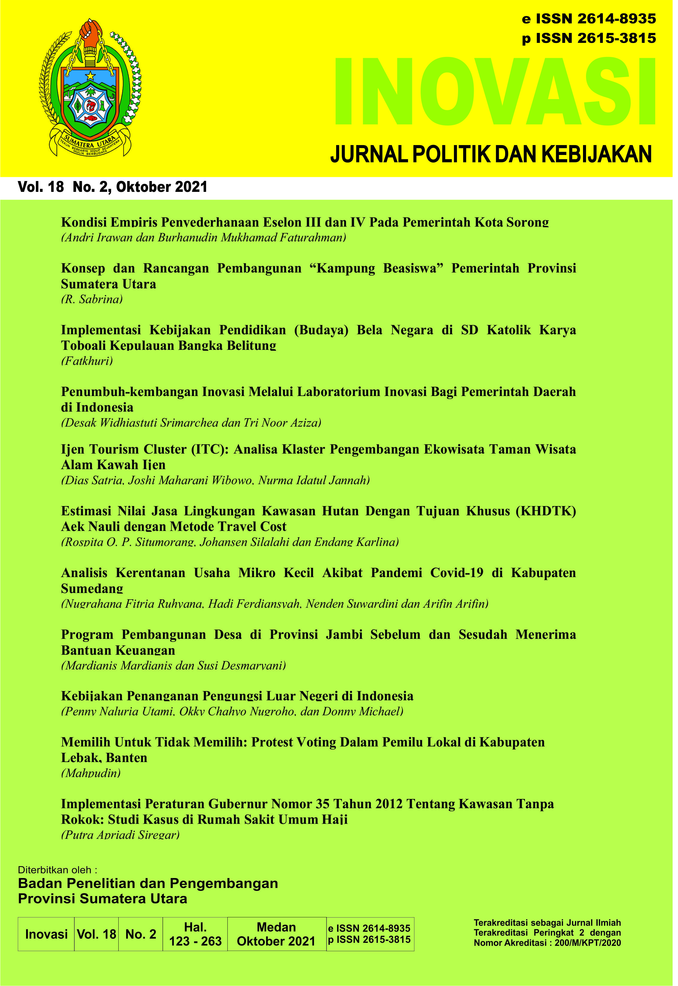 Seiring dengan transformasi pemerintahan di Provinsi Sumatera Utara, laman INOVASI: Jurnal Politik dan Kebijakan telah mengalami perubahan menjadi https://jurnal.sumutprov.go.id. Perubahan ini menjadi momentum bagi Redaksi untuk berkomitmen menghadirkan artikel ilmiah yang berkualitas dan berdampak. Kami menyampaikan apresiasi kepada para penulis, mitra bestari, dan seluruh pihak yang telah berkontribusi pada edisi Oktober 2025. Semoga artikel yang tersaji menambah wawasan keilmuan dan menjadi bahan rujukan dalam menjawab permasalahan pembangunan.