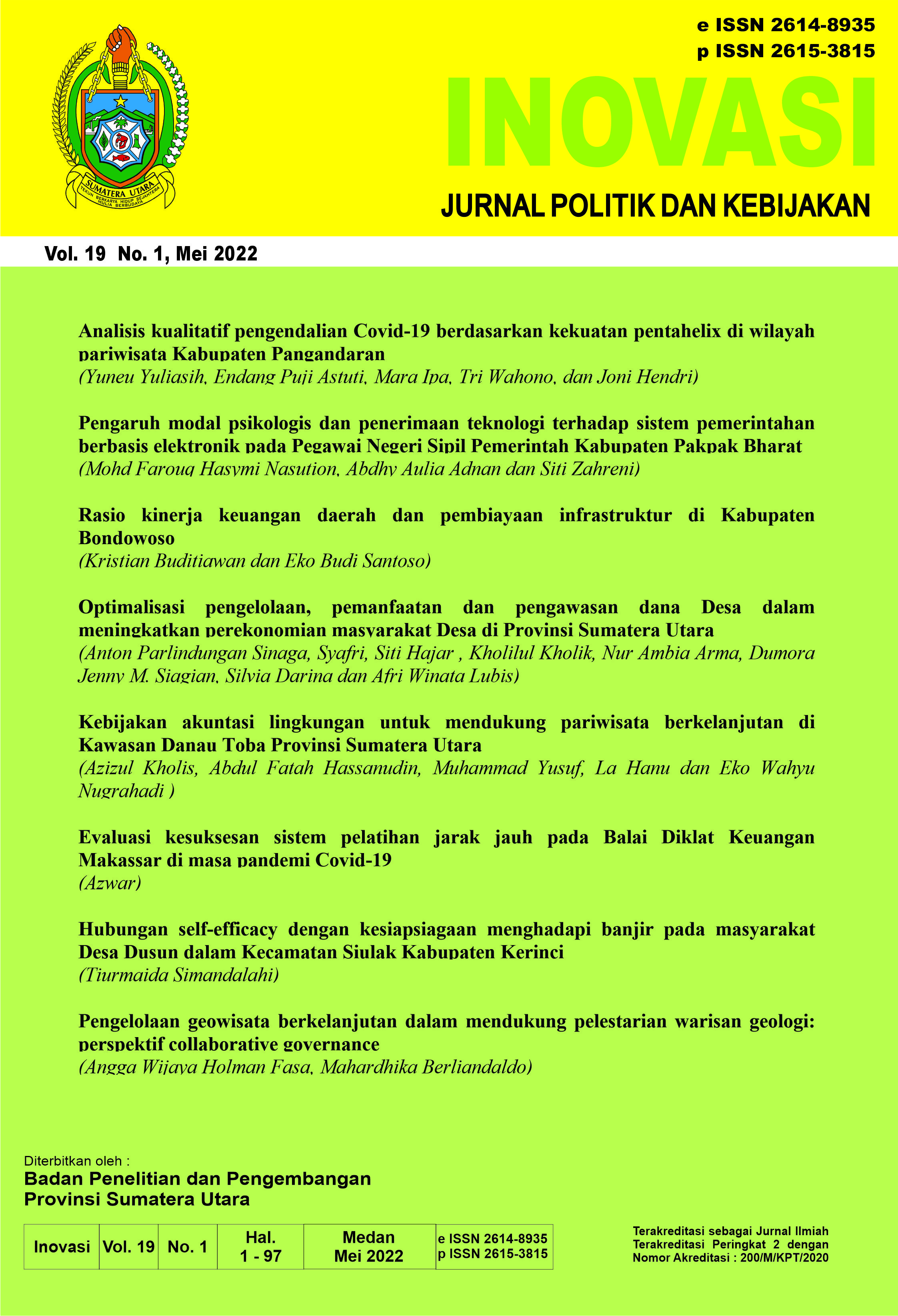 Tulisan tentang pengendalian Covid-19 di wilayah pariwisata Kabupaten Pangandaran menjadi artikel pembuka pada edisi Mei 2022, dilanjutkan dengan tulisan tentang pengaruh modal psikologis dan penerimaan teknologi di Kabupaten Pakpak Bharat. Tulisan dengan tema ekonomi dan keuangan turut meramaikan Jurnal INOVASI edisi Mei 2022 yaitu: rasio kinerja keuangan daerah dan pembiayaan infrastruktur di Kabupaten Bondowoso; optimalisasi pengelolaan, pemanfaatan dan pengawasan dana desa di Provinsi Sumatera Utara; serta, kebijakan akuntansi lingkungan di kawasan Danau Toba.