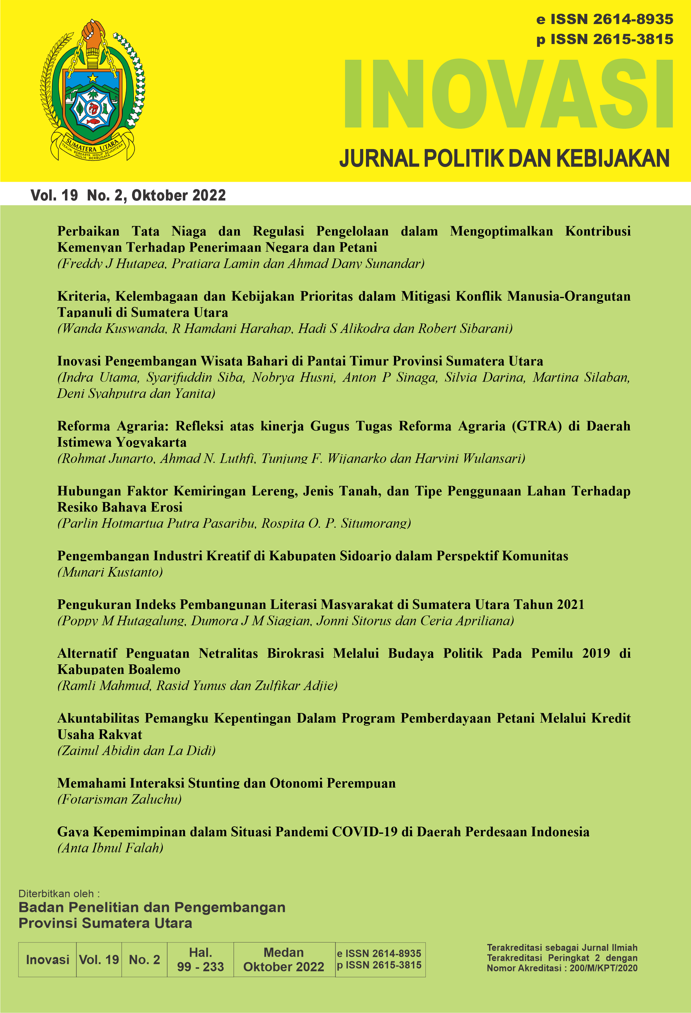 Tema lain yang turut mengisi Jurnal INOVASI antara lain tentang: industri kreatif, indeks literasi di Sumatera Utara, budaya politik pemilu, dan akuntabilitas pemangku kepentingan. Jurnal INOVASI volume 19 tahun 2022 ditutup dengan dua artikel tinjauan kepustakaan tentang stunting dan gaya kepemimpinan di masa pandemi Covid-19.