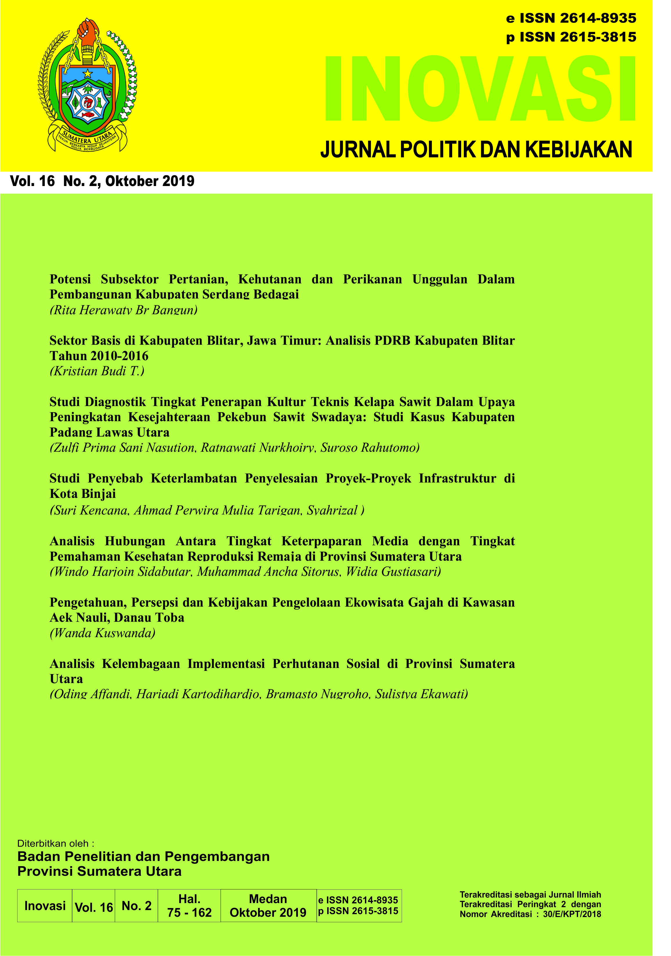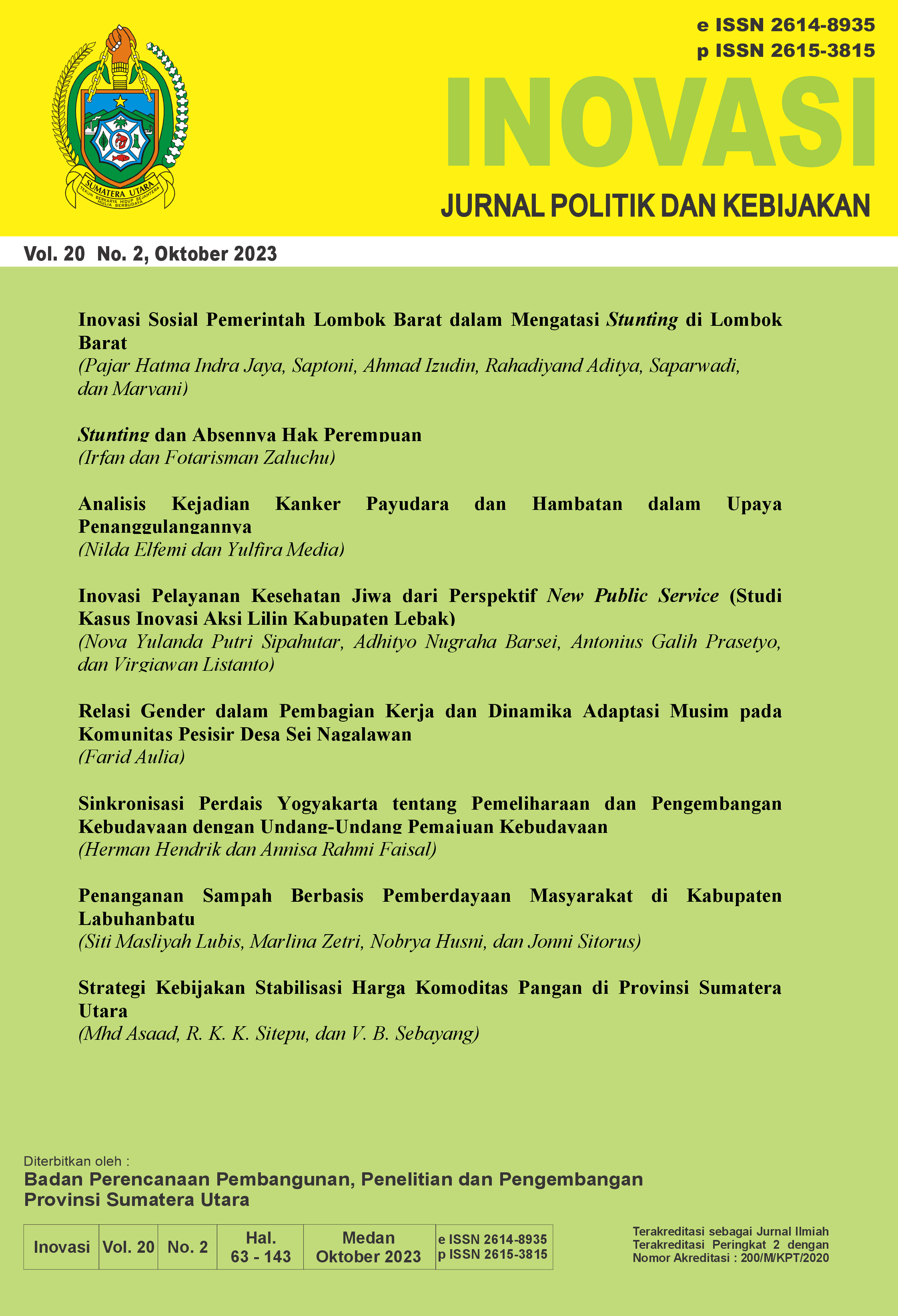 INOVASI: Jurnal Politik dan kebijakan edisi Oktober 2023 yang diterbitkan oleh Badan Perencanaan Pembangunan, Penelitian dan Pengembangan Provinsi Sumatera Utara kembali hadir menyajikan karya tulis ilmiah dengan judul yang sedang menjadi topik hangat di Sumatera Utara pada khususnya dan Indonesia pada umumnya. Terbitan kali ini diawali dengan artikel hasil penelitian dengan topik stunting, yaitu “inovasi sosial dalam mengatasi masalah stunting di Lombok Barat”. Artikel berikutnya adalah tinjauan kepustakaan dengan topik yang sama dengan judul “stunting dan absennya hak perempuan”. Artikel dengan topik kesehatan lainnya yang turut hadir dalam terbitan kali ini adalah: “analisis kanker payudara dan hambatan dalam upaya penanggulangannya”, serta “inovasi pelayanan kesehatan jiwa dari perspective New Public Service”.