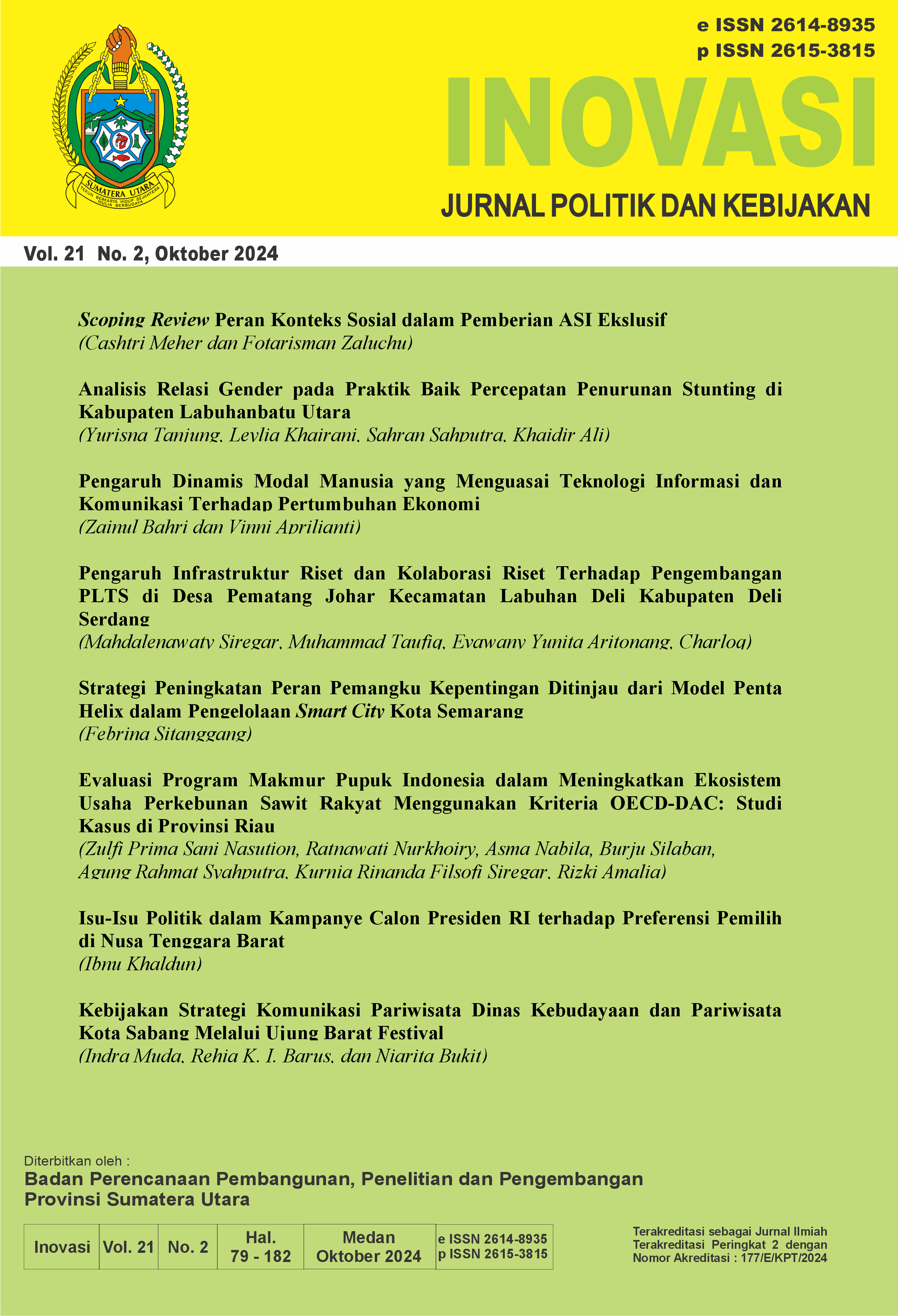 INOVASI: Jurnal Politik dan Kebijakan edisi Oktober 2024 menghadirkan beragam topik, mulai dari kesehatan, pendidikan, pertanian, energi, pariwisata, hingga artikel bertema politik. Artikel bertema kesehatan berjudul “scoping review peran konteks sosial dalam pemberian ASI ekslusif”, dilanjutkan dengan artikel yang membahas tentang analisis relasi gender pada penurunan stunting, menjadi artikel pembuka edisi Oktober 2024. Artikel berikutnya membahas tentang modal manusia yang menguasai teknologi informasi dan komunikasi, dilanjutkan dengan artikel bertema energi tentang pengembangan Pembangkit Listrik Tenaga Surya (PLTS). Artikel tentang strategi peningkatan peran pemangku kepentingan dalam pengelolaan smart city Kota Semarang, serta artikel yang membahas evaluasi program Makmur Pupuk Indonesia dan isu-isu politik dalam kampanye calon Presiden Republik Indonesia, turut mengisi edisi kali ini. INOVASI: Jurnal Politik dan Kebijakan edisi Oktober 2024 ditutup dengan artikel tentang strategi komunikasi Dinas Pariwisata dan Kebudayaan Kota Sabang.Semoga artikel yang tersaji pada edisi kali ini menambah khasanah keilmuan, serta menjadi rujukan dalam menjawab permasalahan pembangunan.