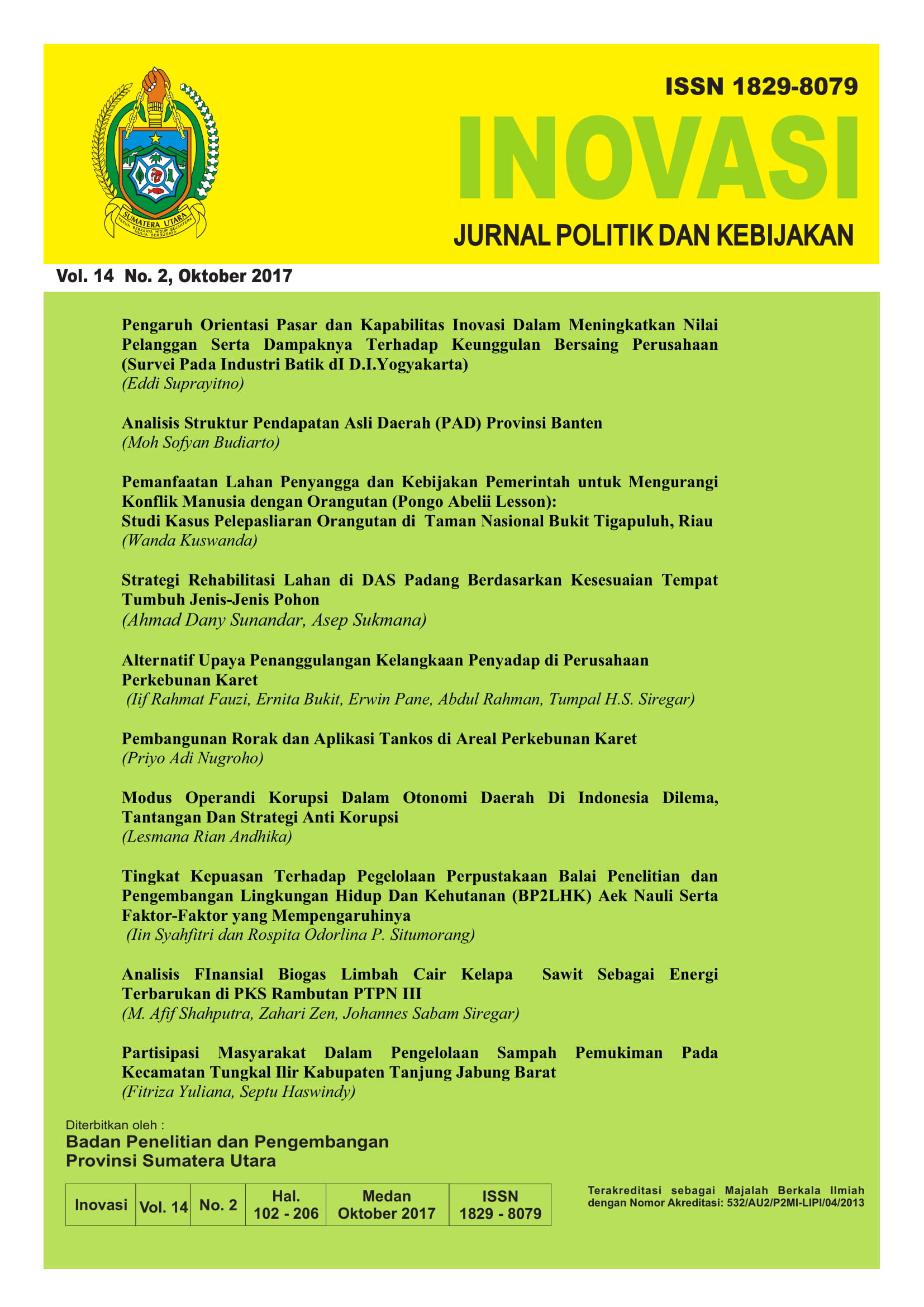 Badan Penelitian dan Pengembangan Provinsi Sumatera Utara melalui Jurnal INOVASI edisi Oktober 2022, kembali menyajikan artikel ilmiah dengan tema yang beragam. Diawali dengan artikel tentang sumber daya alam yang dimiliki Sumatera Utara yaitu, kemenyan, orangutan dan wisata bahari. Selanjutnya artikel tentang reforma agraria dan resiko bahaya erosi pada lahan menjadi sajian yang melengkapi edisi kali ini.