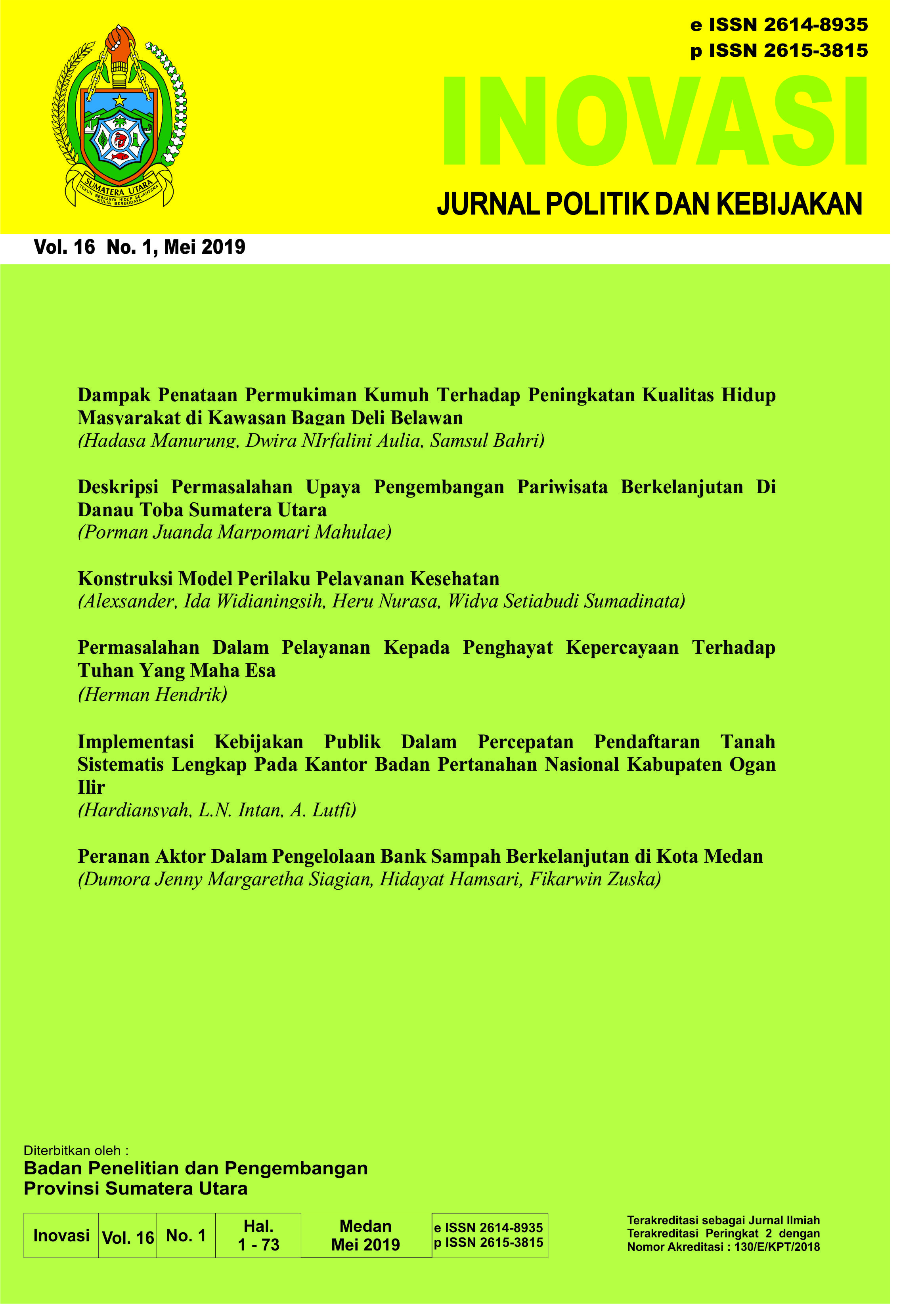 Terbitan Mei 2019 memuat berbagai topik yaitu permukiman, pariwisata, kesehatan, lahan dan lingkungan. Artikel pertama yaitu dampak penataan permukiman kumuh di kawasan Bagan Deli Belawan yang sampai saat ini masih menjadi persoalan dalam penataan daerah pesisir. Selanjutnya artikel tentang permasalahan pengembangan pariwisata Danau Toba, diikuti dengan artikel tentang model perilaku pelayanan kesehatan. Edisi kali ini juga memuat masalah sosial terkait penghayat kepercayaan terhadap Tuhan Yang Maha Esa. Artikel tentang kebijakan pertanahan dan pengelolaan sampah turut mengisi jurnal INOVASI Volume 1 Mei 2019.